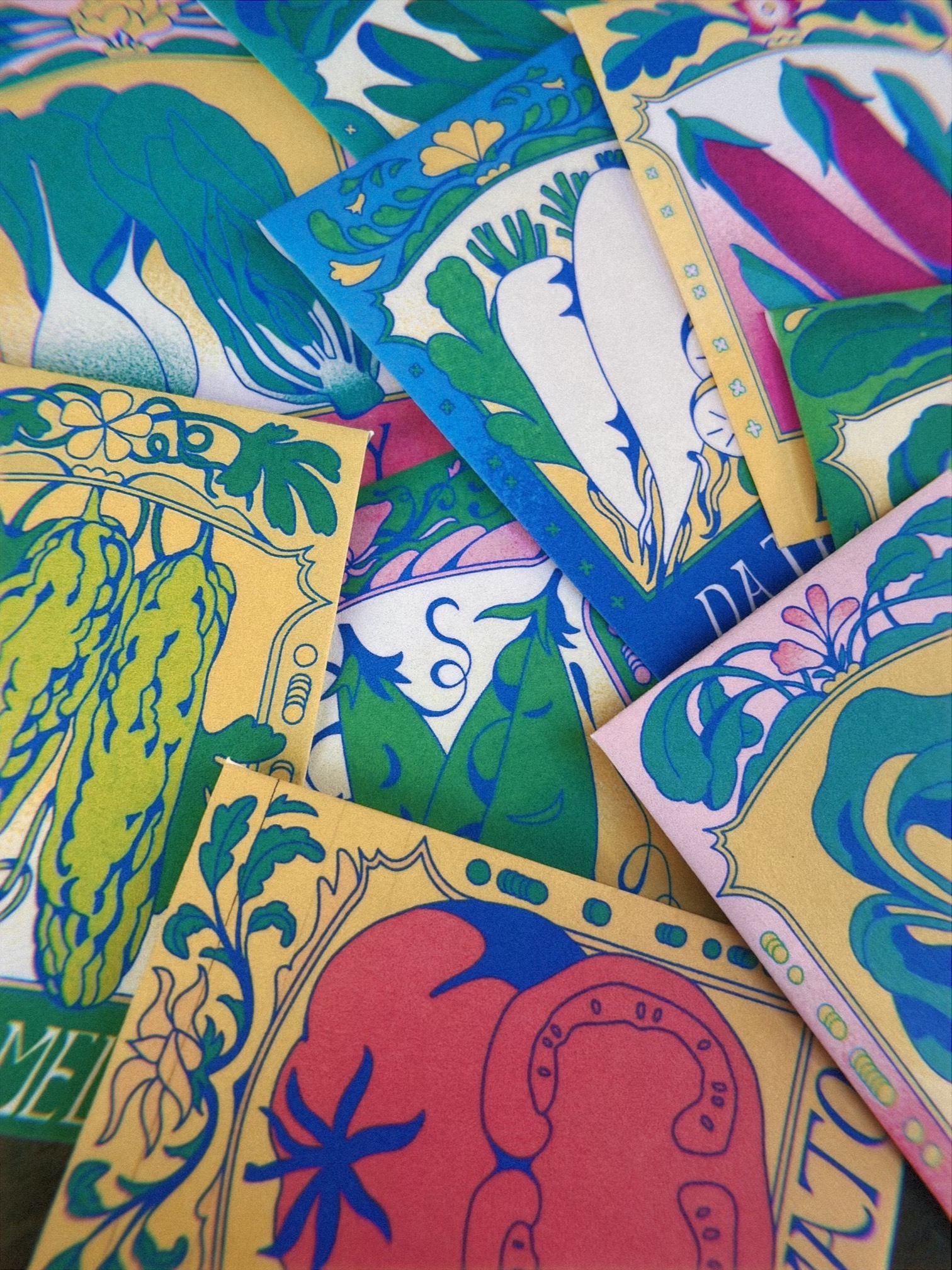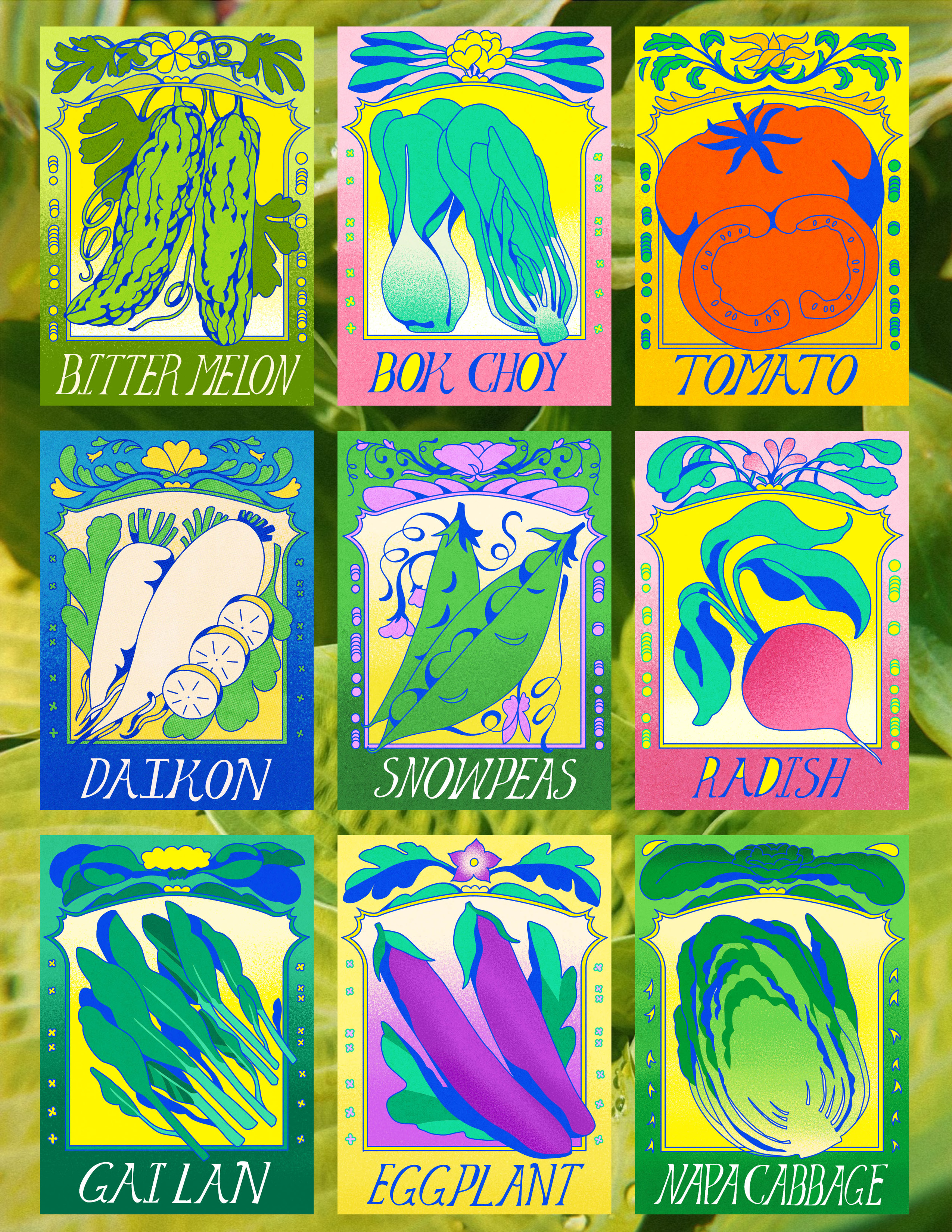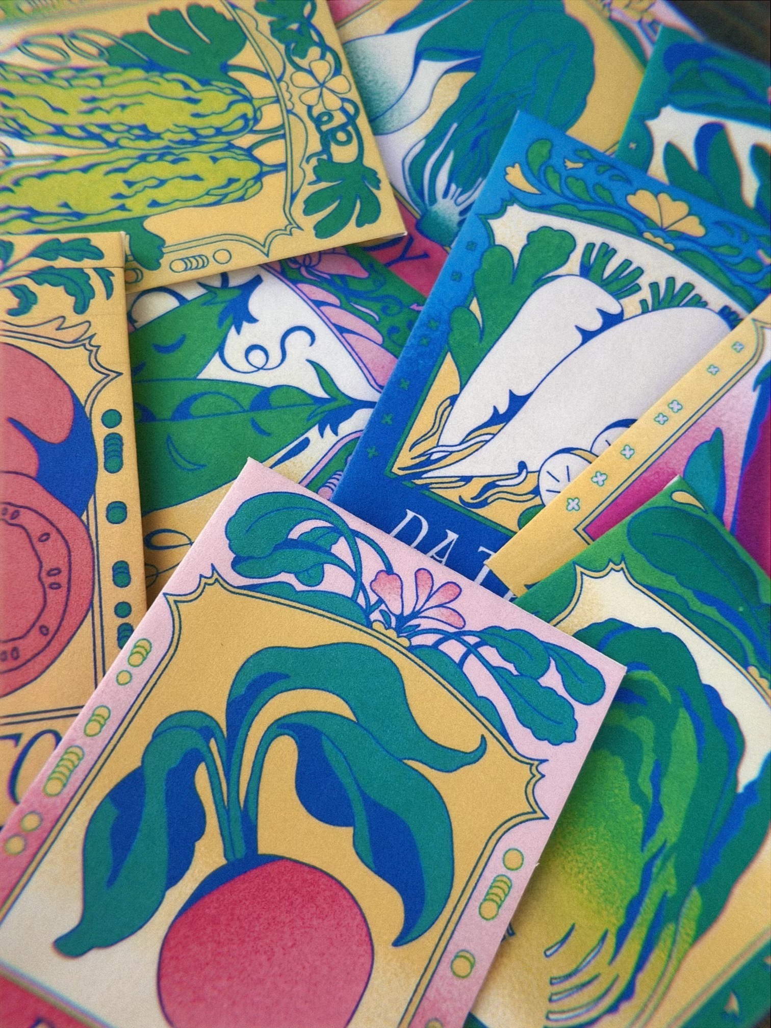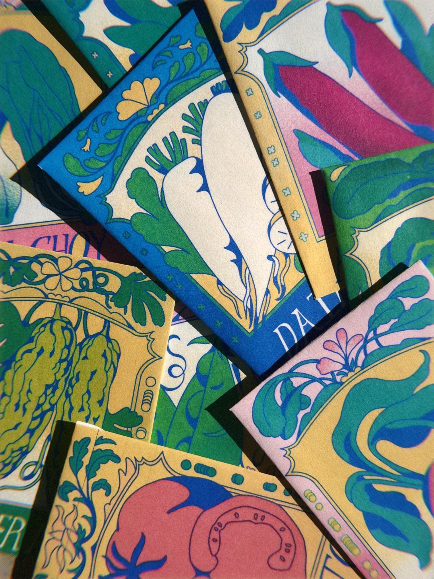 Seed Packets! I wanted to redesign some of my favorite veggies’ seed packets by combining a vintage chinese label look with contemporary design asthetics. I printed them out and folded them after completing the design in Adobe Illustrator.